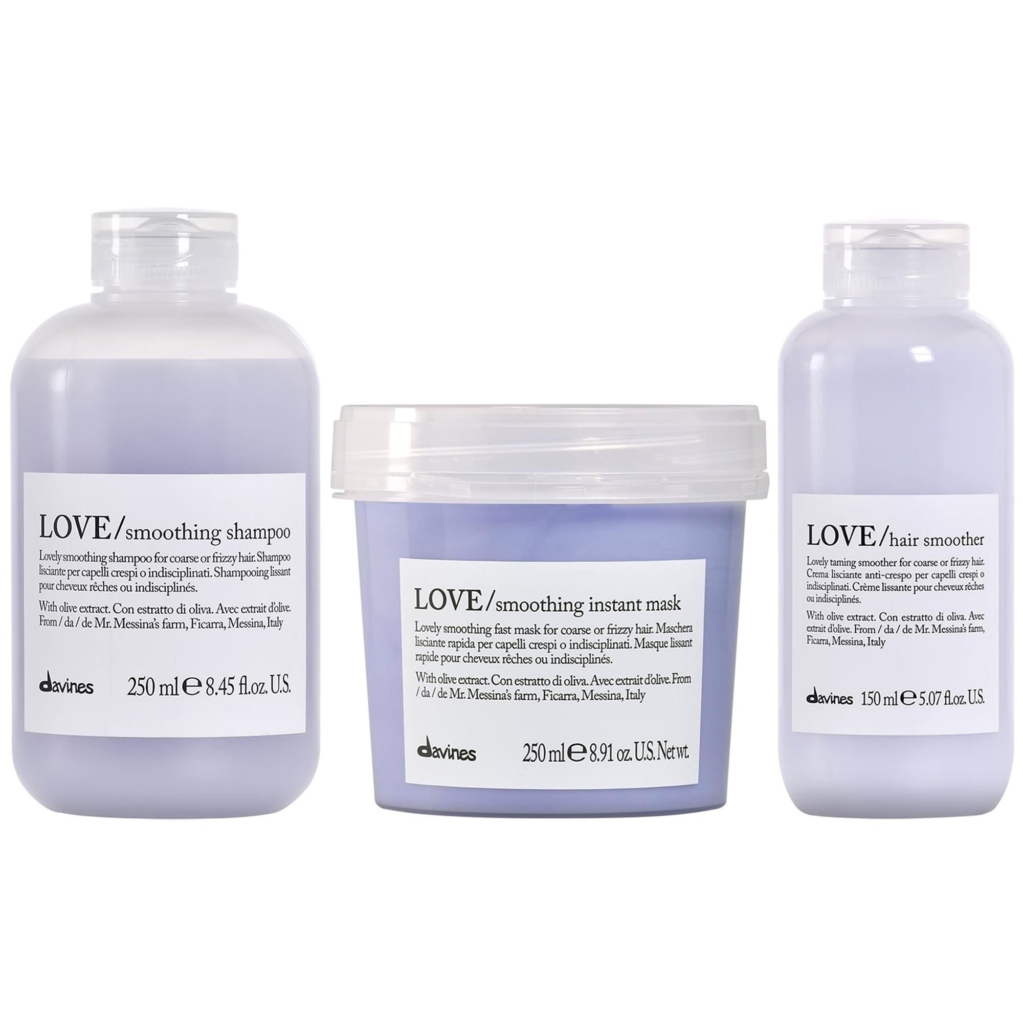 |Shampoo anti frizz, acondicionador, crema y sérum|Ideal para todo tipo de cabello con frizz o cabello alisado|Controla el frizz instantáneamente|Reduce el volumen no deseado|Proporciona hidratación|Contiene ingredientes activos naturales|El cabello queda sin frizz, suave, manejable y con brillo duradero|Fórmula enriquecida con extracto de oliva que es rico en ácidos grasos y vitamina E|Contenido de cada frasco: Shampoo 1000ml, Acondicionador 1000ml, Crema 150ml, Sérum 150ml|No se aceptan devoluciones|